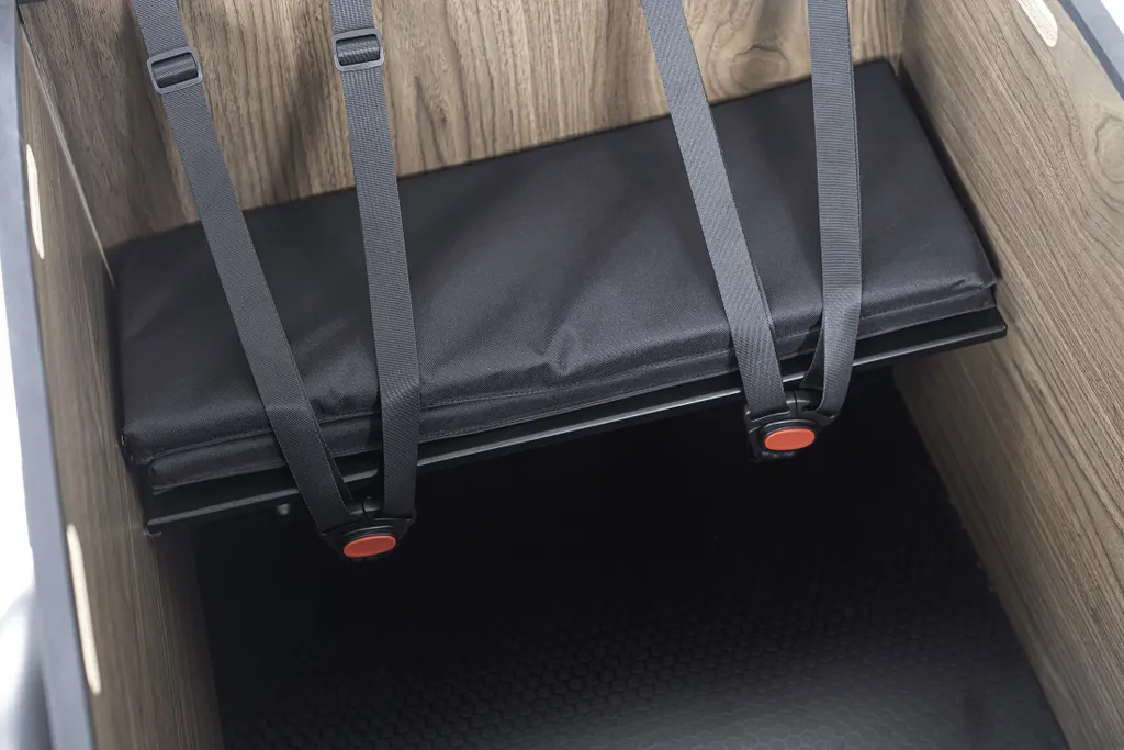 Für den sicheren Kindertransport sind gepolsterte Sitze mit Dreipunktgurten vorhanden und das schichtverleimte Holz der Box ist auf Schadstoffe und Bruchsicherheit geprüft. 🛡️