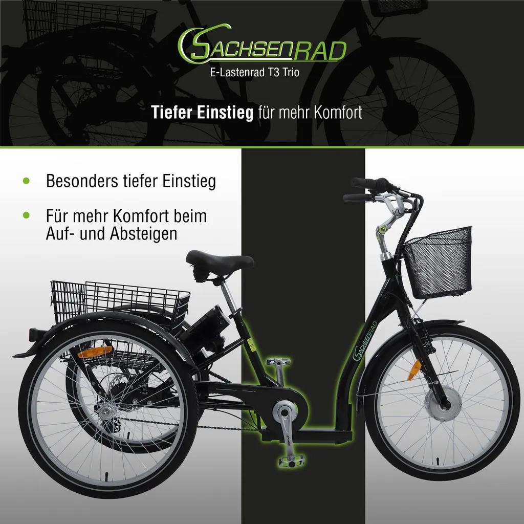 • Fühl dich superstabil und sicher auf drei Rädern! 🚲🚲🚲 Das SachsenRAD T3A Trio bringt dich dank seiner drei 24-Zoll-Räder und des tiefen Einstiegs mühelos und sicher durch die Stadt, ganz ohne Unsicherheit.